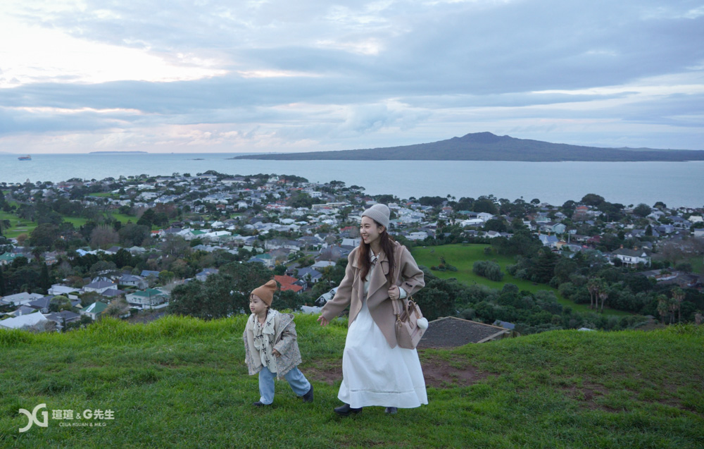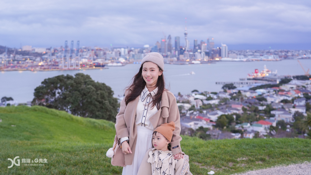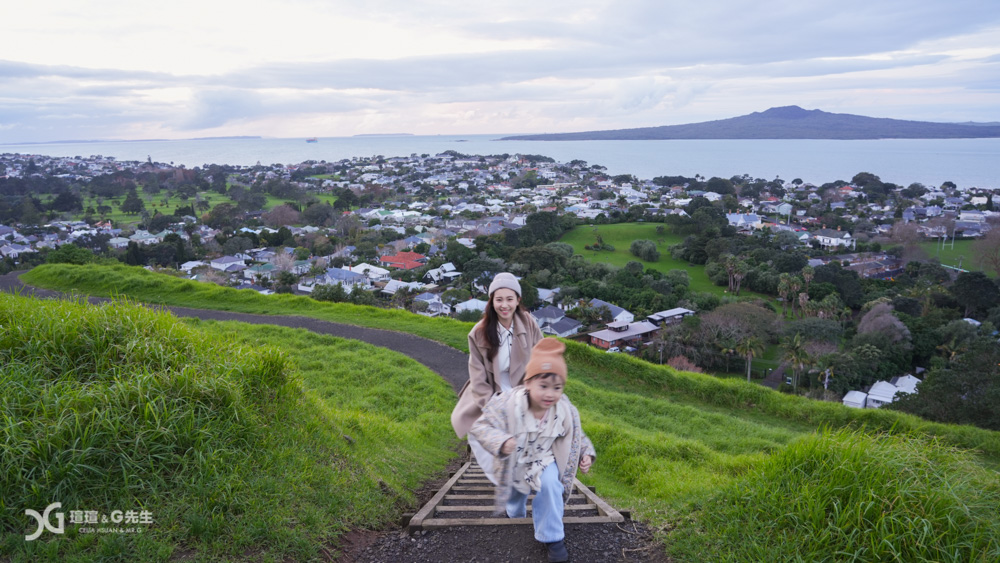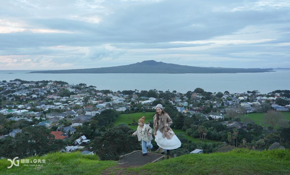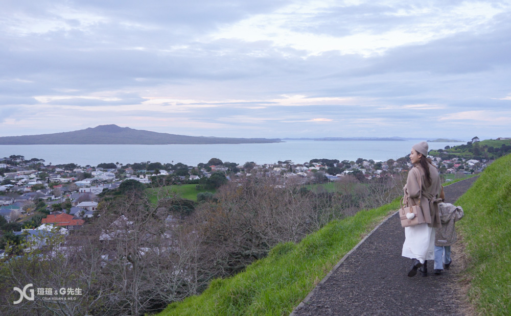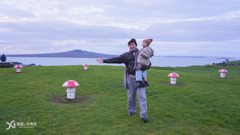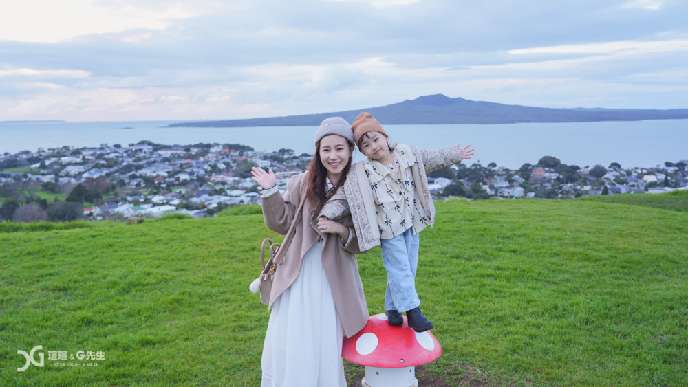 抵達山頂後景色非常驚艷,有360度全景,一邊能看到火山與海灣,另一邊遠眺奧克蘭的城市,可以各自拍一張照片。地上還有被塗成蘑菇的舊防空碉堡的排氣孔,拍照起來也非常的可愛。