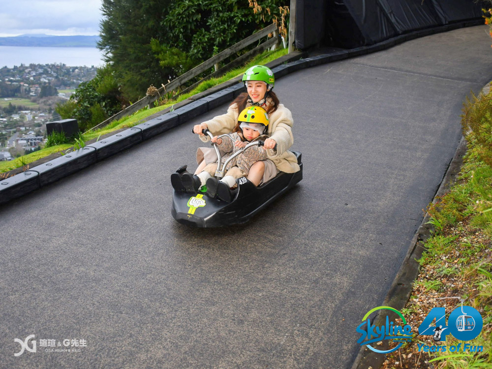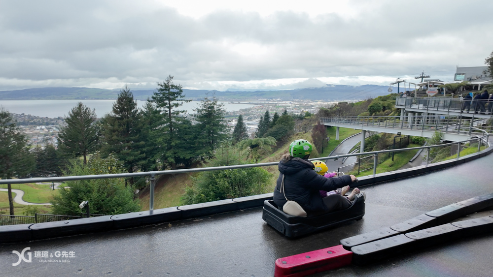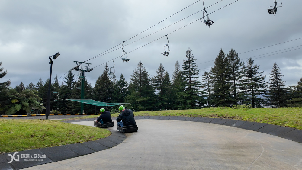 餐後體驗 Luge 斜坡溜溜車——雖然那天下雨,安全帽真的有點臭😅,但滑下山的過程又刺激又過癮,我們在紐西蘭的南島、新加坡都有體驗過Skyline Luge,這裡算是很好玩的,夠長也夠彎也夠快!