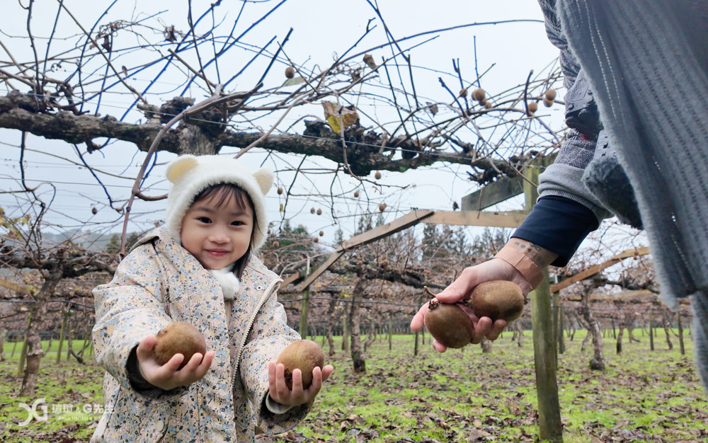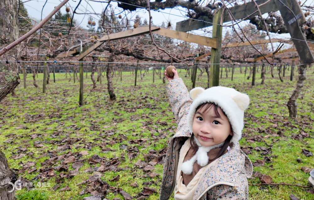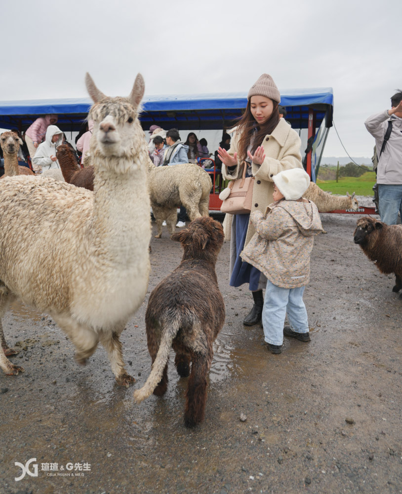 接著坐著拖拉車,我們來為羊駝、綿羊、摘奇異果,當天下著小雨,場面有點混亂,栗子一看到羊和草泥馬靠近就緊張喊:「No! No! No!」。